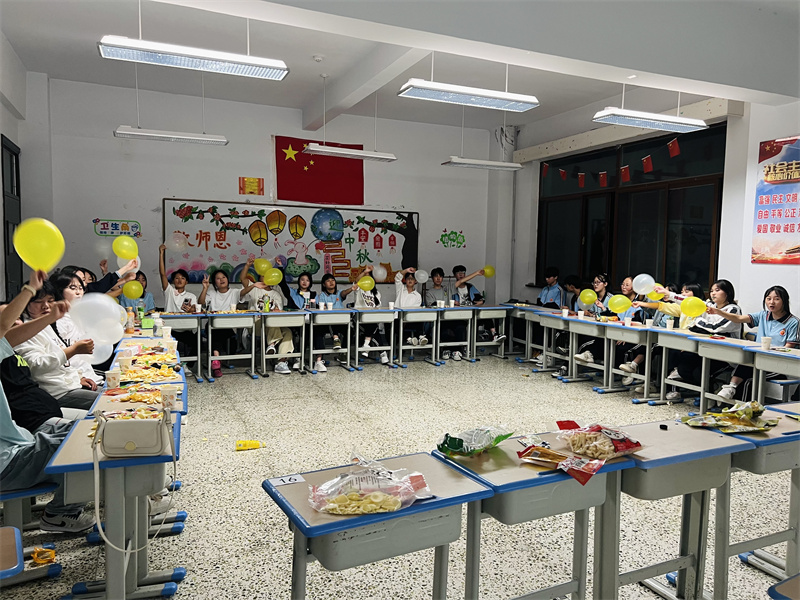 9月17日晚19:30,学校各班级张灯结彩,在享受浓郁的传统节日氛围中引导学生珍惜生命,珍惜生活。师生一起参加中秋晚会,表演节目,畅谈生活,分享着各种月饼和精美食物,歌声、笑声和音乐声回荡在校园的每个角落。