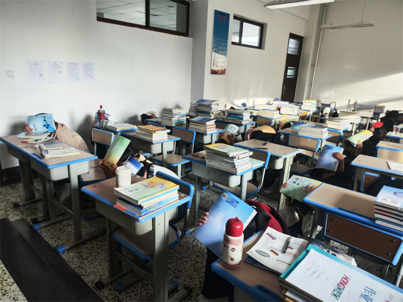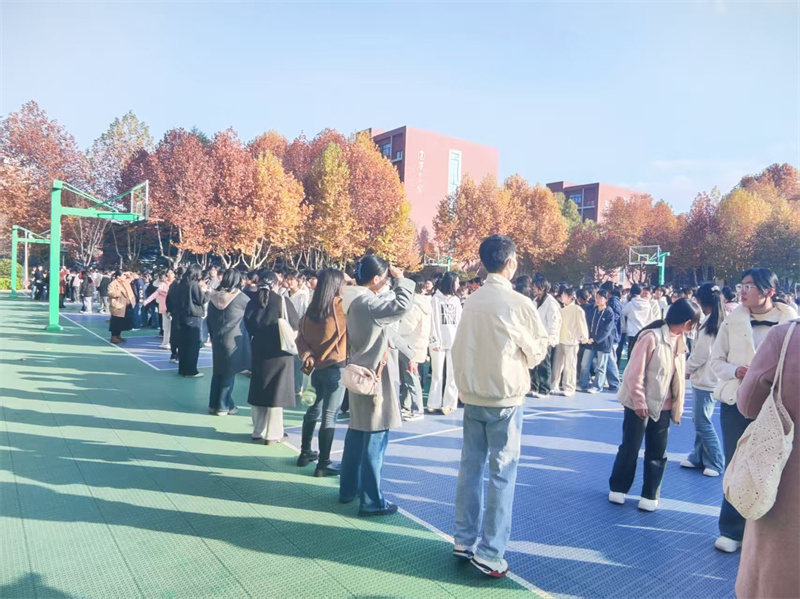 讲座结束后,地震应急疏散演练按预定方案分场景、分步骤展开。首先模拟的是宿舍生活场景下的应急避险。随着警报响起,在各宿舍的同学们立即采取紧急避险措施,当疏散指令响起,各公寓楼同学在宿管的引导下,迅速按疏散路线分别向集合地点疏散。简短的整顿后全体师生回到教室,又开展了一次教学楼场景下的疏散演练。模拟情景为上课期间发生地震,各班班主任组织本班学生迅速蹲于课桌旁避险,听到疏散指令,全体师生按照应急预案和疏散线路,快速、有序地撤离至相应的集合区域。最后全体师生在教学楼前广场集合,以班级为单位向活动总指挥汇报了演练情况。