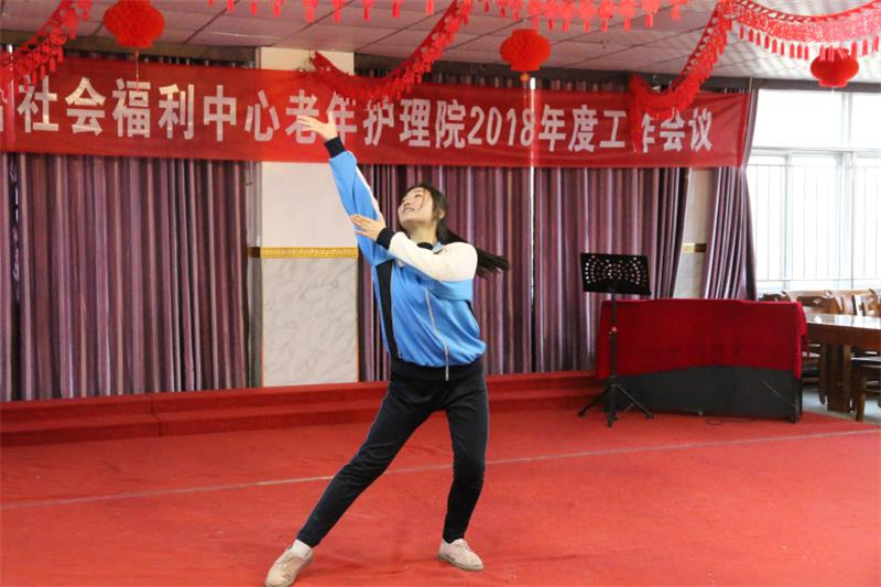 最后,志愿者服务队员又集中在老人的餐厅,表演了自己精心准备好的节目,有青春活力的舞蹈表演《咖喱咖喱》、优美的傣族舞、古典舞等,还有诗歌朗诵《长征颂》,小合唱《闪闪的红星》,歌伴舞《感恩的心》。年龄上的差距并没有阻碍他们的交流,整个养老院充满了欢声笑语,到处沉浸在欢乐与爱的氛围中。