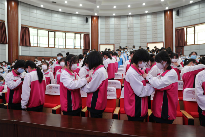 大会在雄壮的国歌声中拉开帷幕。全体团员在教师团员杨虹的带领下进行入团宣誓,新团员相互佩戴了团徽。