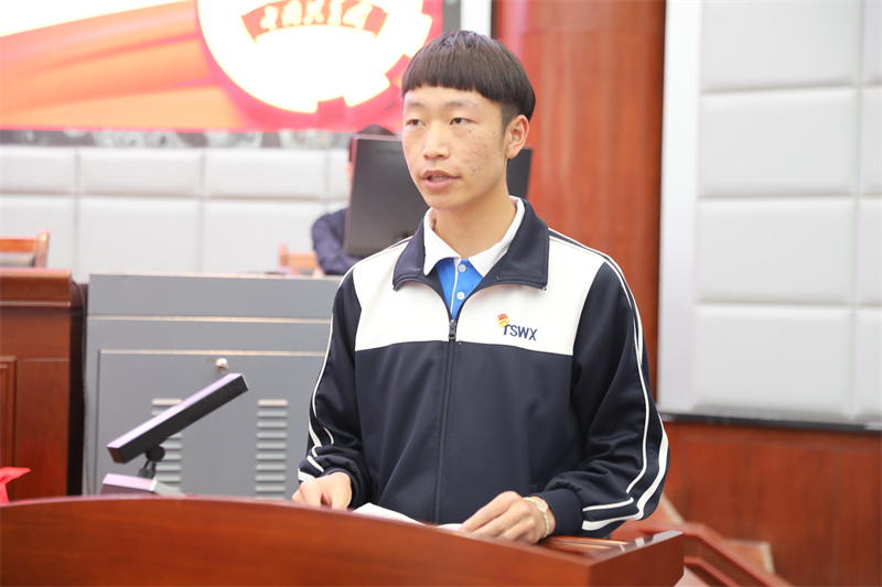 2021级高职护理班宋鑫怡同学代表新团员发言。表示加入共青团组织后一定会努力学习积极向上,充分发挥团员模范带头作用,用实际行动来表明自己无悔于共青团员这个光荣的称号,将“修德立信 博学济世”的天水市卫生学校精神发扬光大。