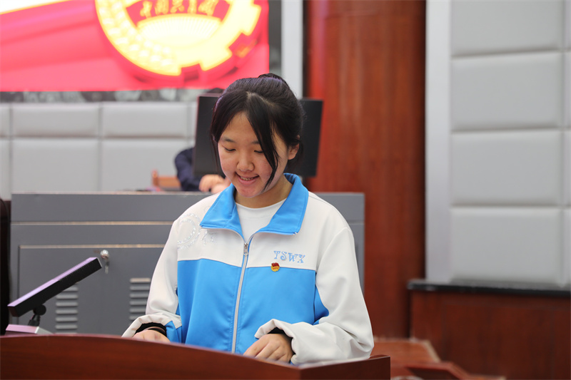 大会在雄壮的国歌声中拉开帷幕。会上,全体团员进行了入团宣誓,校领导为新团员代表佩戴了团徽。团委书记孙文婷宣读了《团章》,同学们认真聆听,共同学习。