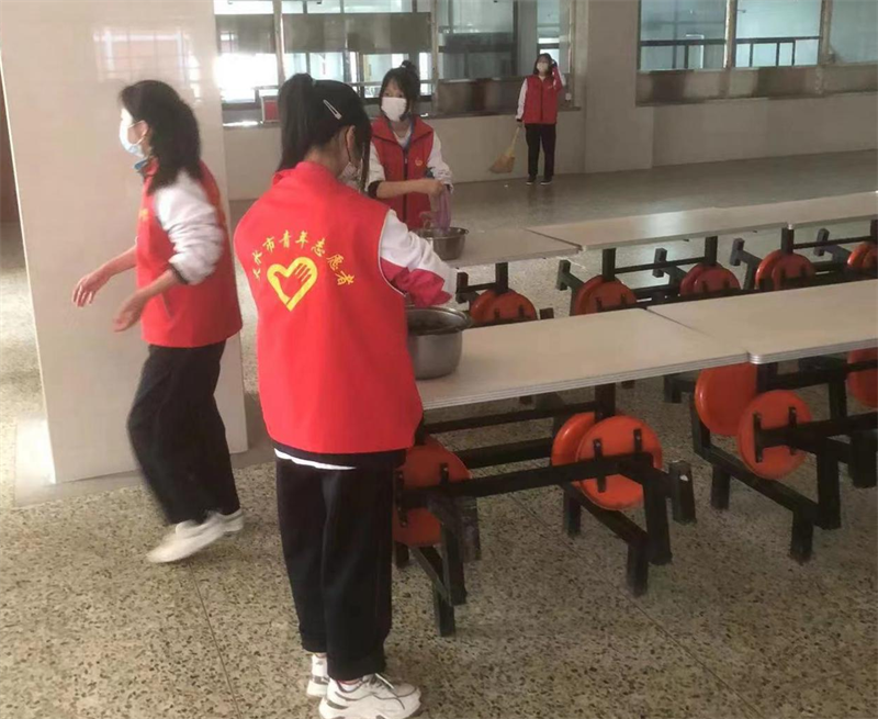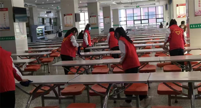 3月9日,志愿者们打扫食堂卫生