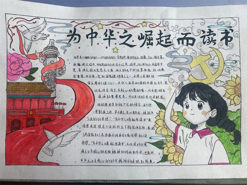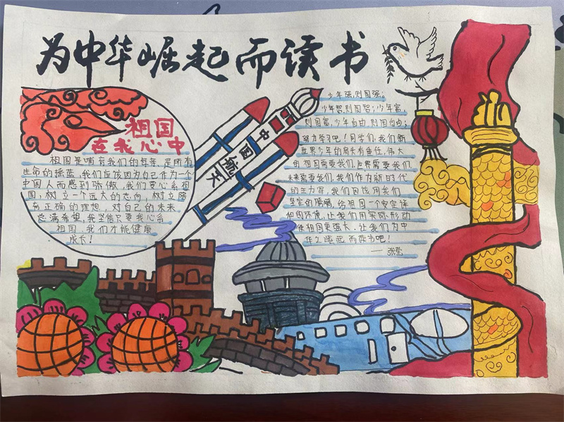 同学们利用课余时间搜集相关资料,通过动手、动脑、绘画,制作了一幅幅主题鲜明、图文并茂、色彩斑斓的手抄报,抒发了对党和祖国的无限热爱,展现了作为一名当代学生的使命与担当。同学们纷纷表示,今后要努力践行“强国有我,请党放心”的庄严承诺,为中华之崛起而读书,为实现中华民族伟大复兴贡献自己的青春力量。