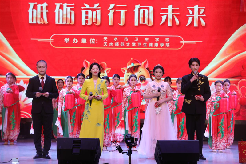 岁序更替,华章日新。12月26日下午,天水市卫生学校与天水师范大学卫生健康学院联合举办的“同心筑梦绽芳华 砥砺前行向未来”元旦文艺汇演,在天水师范大学大礼堂隆重举行。天水师范大学、市教育局相关领导莅临现场,与学校班子成员及师生代表700余人欢聚一堂,共襄盛典。与此同时,各班级教室同步进行直播,未能亲临现场的同学通过屏幕共享欢乐,线上线下交融共鸣,校园内外洋溢着喜庆祥和的迎新氛围。