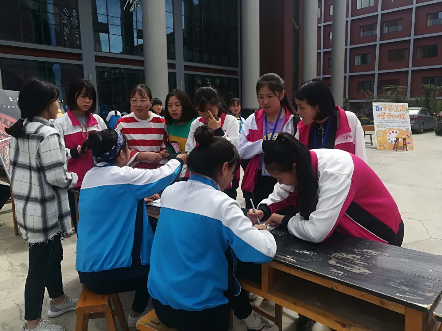 9月10日至9月15日,我校学生社团在学校餐厅楼外的广场上进行招募新社员活动。本学期,校团委共开设金孔雀艺术团、DIY手工俱乐部、校广播站、六零吉他社、七彩画室、白帆文学社、校排球队、校篮球队等8个学生社团。
