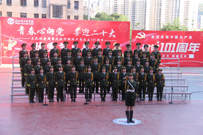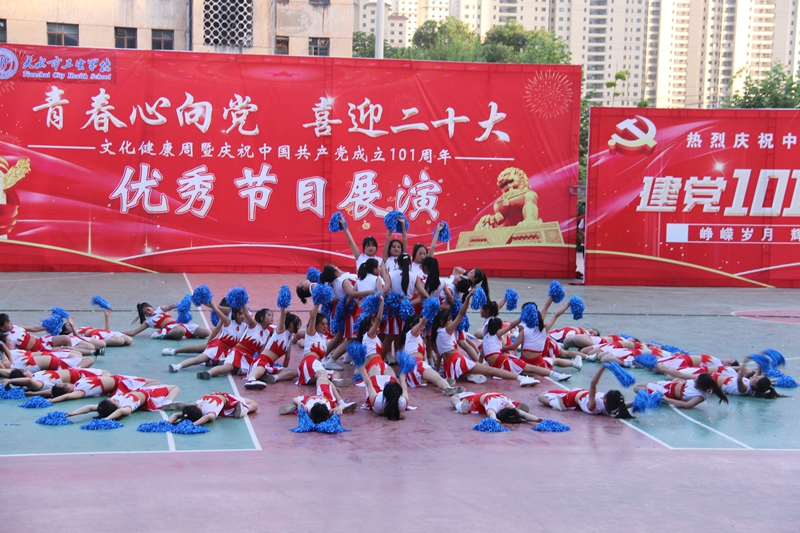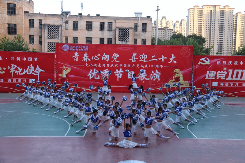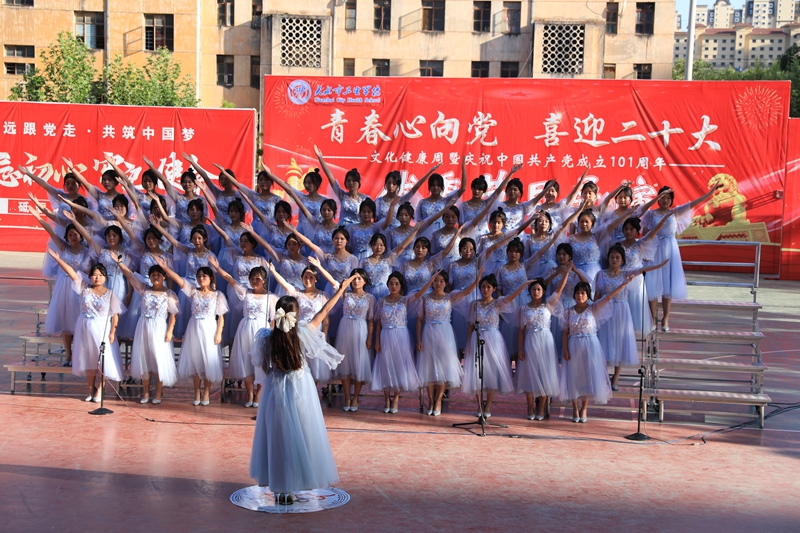 为庆祝中国共产党成立101周年,迎接党的二十大胜利召开,进一步增强党组织的凝聚力,建设文化和谐健康校园,2022年7月5日下午,学校在教学楼前广场举行了以“青春心向党喜迎二十大”为主题的庆“七一”建党节文化健康周优秀节目展演活动。