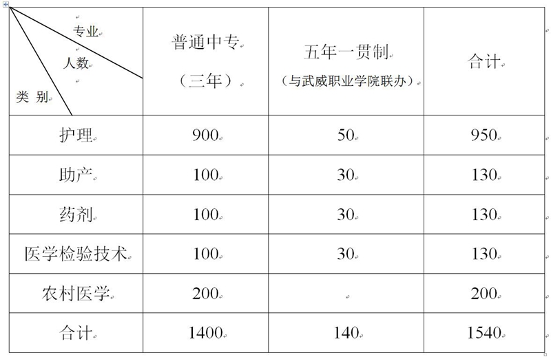 多年以来,学校坚持“以服务为宗旨,以就业为导向”的职业教育办学方针,不断优化专业结构,积极开展多层次、多形式办学。目前学校有普通中专、五年一贯制(高职)和成人高等教育三个办学层次;开设专业有护理、助产、药剂、农村医学、医学检验技术;其中五年一贯制(高职)为与武威职业学院联办,继续教育是为与兰州大学、甘肃中医药大学、西安交通大学联办成人高等教育。学校还是省、市卫生技术人才在职培训基地,年培训在职卫生技术人员约1000人。