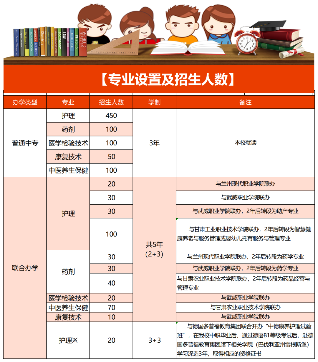 近年来,学校秉承“高起点谋划,高层次定位,高品位建设,高质量教学”的办学思路,不断优化专业结构,积极开展多层次、多形式办学。目前学校有普通中职、五年制高职和成人高等教育三个办学层次;开设有护理、药剂、医学检验技术、中医康复技术、中医养生保健等专业, 其中护理、药剂2个专业为省级骨干专业(省级“双优”中职学校重点建设优质专业),护理专业为学校的传统品牌优势专业;学校还与兰州现代职业学院、武威职业学院等省内高职院校联办五年制高职。与兰州大学、甘肃中医药大学、甘肃医学院等高等院校联办成人高等教育。拥有二级以上教学医院30多所,药品生产营销实习基地3家。2019年,学校与德国多普福教育集团达成合作办学协议,联合开办“中德康养护理实验班”;2021年4月与甘肃工业职业学院深度合作,成立“康养产业学院”。