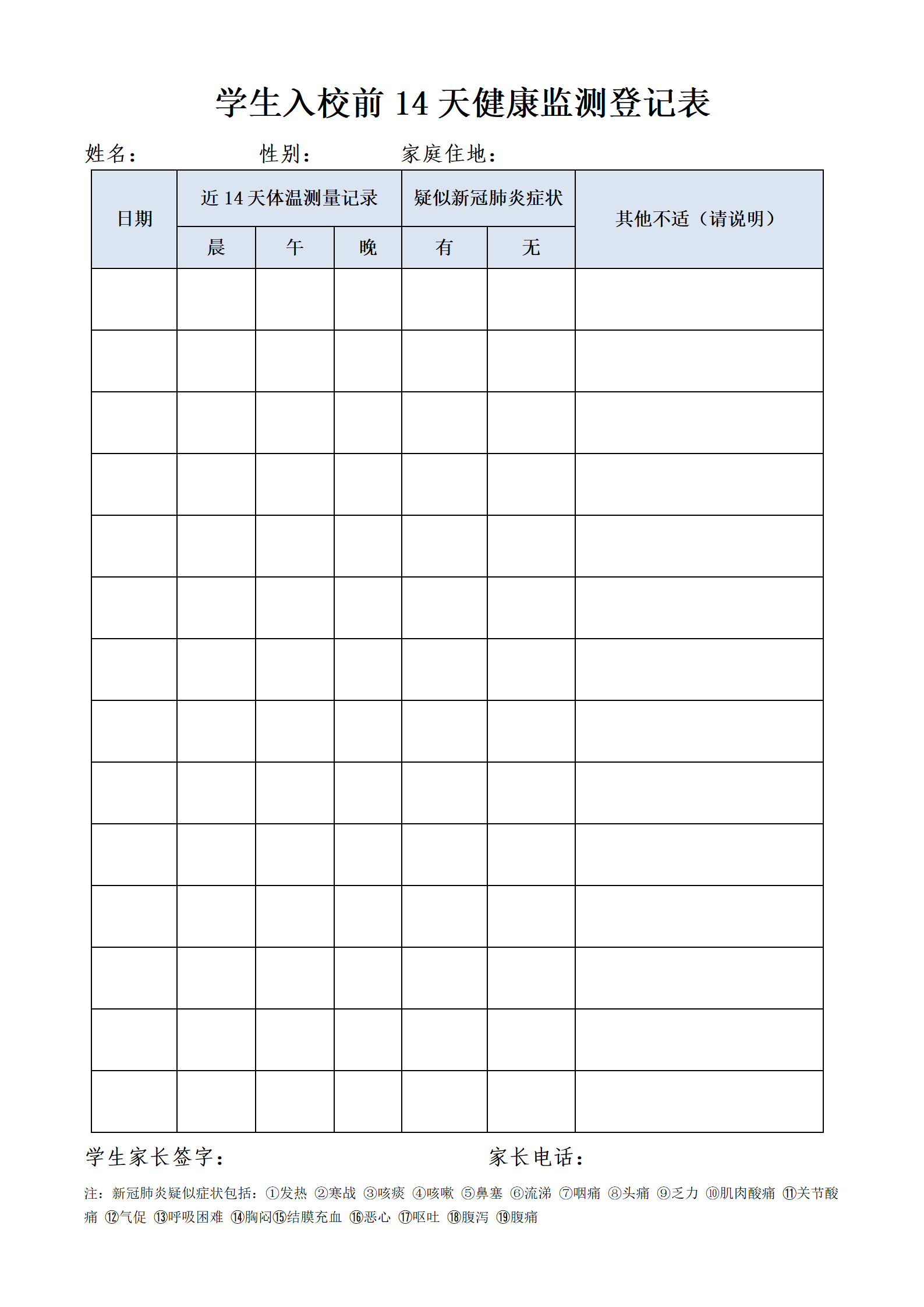 附件:《学生入校前14天健康监测登记表》