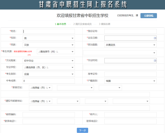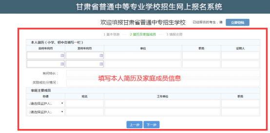 特别提示:“家庭主要成员”一栏请至少填写一位家庭成员(如果考生是由监护人管理,在“称谓”一栏选择“其他”,完成后进入下一步。