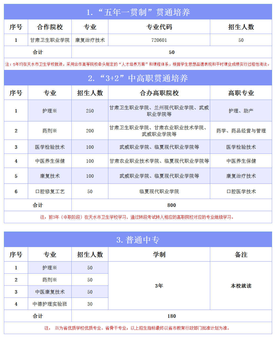 1.“五年一贯制”贯通培养:学制5年,均在天水市卫生学校就读,前3年注册中职学籍,后2年注册高职学籍,完成学业并达到毕业要求发放贯通培养合作高职院校高职毕业证书。