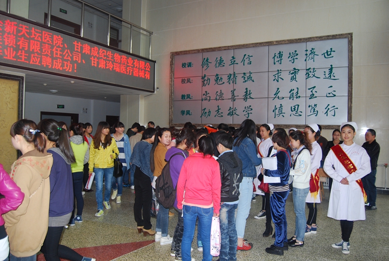 4月25日上午,我校举办了2014届毕业生校园专场招聘会。天水市中医医院,甘肃成纪生物药业有限公司,兰州惠仁堂药业有限公司,甘肃玲瑞医疗器械有限公司,甘肃省核地质二一九大队职工医院,天水市慈善总会新天坛医院,天水汉博药业有限公司等七家单位入场招聘,600余名同学入场参加了此次招聘会,当天达成初步意向者446人次。