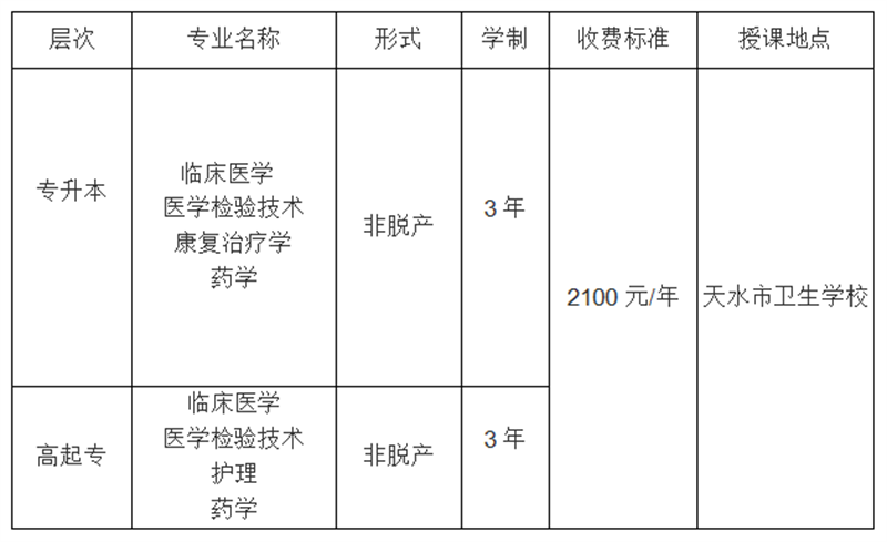 甘肃医学院是甘肃唯一独立设置的西医普通本科院校。学校以普通医学本、专科教育为主,同时举办高等学历继续教育、自学考试、短期培训、职业技能鉴定。高等学历继续教育设有高起专、专升本两个层次,高起专层次开设临床医学、护理、药学、医学检验技术、中药学、针灸推拿6个专业,专升本层次开设临床医学、护理学、药学、医学检验技术、中药学、康复治疗学6个专业,与兰州大学合作开办临床医学、口腔医学,现有在籍学生8000余名。